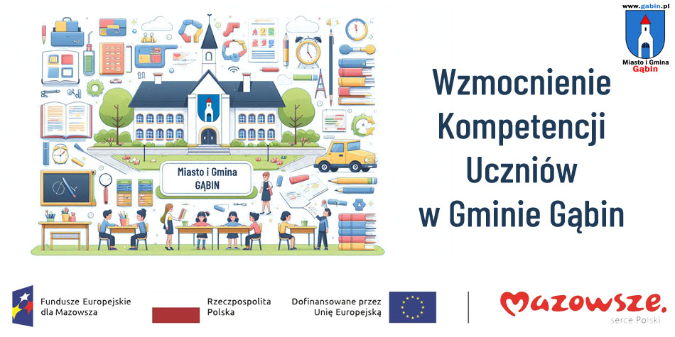 Miasto i Gmina Gąbin w roku szklonym 2025/2026 kontynuuje realizację projektu, pn. „Wzmocnienie kompetencji uczniów w szkołach podstawowych w Gminie Gąbin”, na realizację którego pozyskało kwotę: 759 338,57 zł (w tym 717 153,10 zł z funduszy Unii Europejskiej i 42 185,47zł z budżetu państwa) w ramach programu Fundusze Europejskie dla Mazowsza 2021-2027, Priorytet VII Fundusze Europejskie dla nowoczesnej i dostępnej edukacji na Mazowszu, Działanie 7.2 Wzmocnienie kompetencji uczniów.