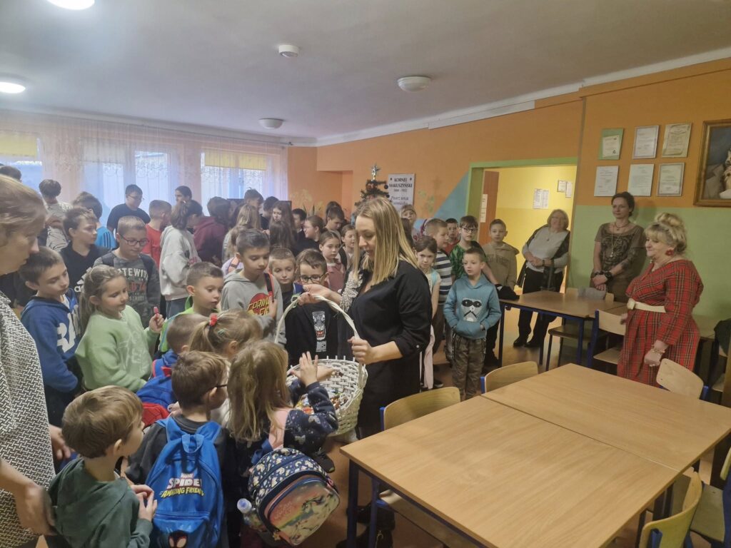 Pani Dyrektor razem z opiekunem Samorządu Uczniowskiego ruszyli z mikołajkową misją i… częstowali wszystkich uczniów słodkimi niespodziankami! ![]()