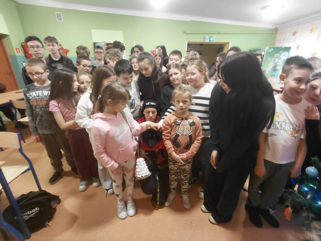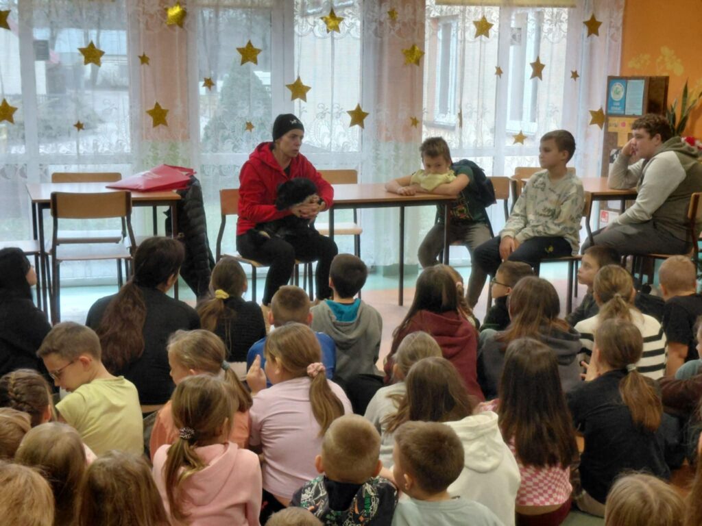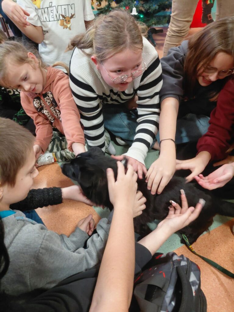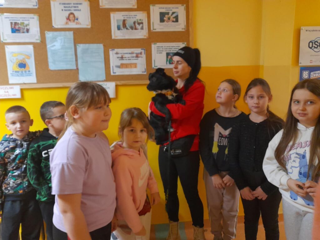 W dniu 09.12.2025 r. w Szkole Podstawowej im. Kornela Makuszyńskiego odbyło się spotkanie z panią Anną Zientarą z FUNDACJI NA RZECZ OCHRONY PRAW ZWIERZĄT „KUNDELEK”. Pani Ania opowiedziała uczniom na temat opieki nad zwierzętami, pracy fundacji na rzecz zwierząt, zapobiegania bezdomności zwierząt oraz przepisach dotyczących adopcji zwierząt. Przypomniała również dzieciom o zachowaniu się w przypadku kontaktu z agresywnymi zwierzętami. Podczas spotkania przekazaliśmy karmę dla psów i kotów zebranych przez uczniów naszej szkoły w ramach akcji „Pełna miska dla schroniska”. Spotkanie przebiegło w miłej atmosferze ponieważ pani Ania przyjechała do nas z pieskiem „Picasso”, którego dzieci mogły dotknąć i pogłaskać. W podziękowaniu otrzymaliśmy dyplom od fundacji „Kundelek”. Dziękujemy pani Annie Zientarze za interesującą pogadankę i zaproszenie do dalszej współpracy ze schroniskiem.