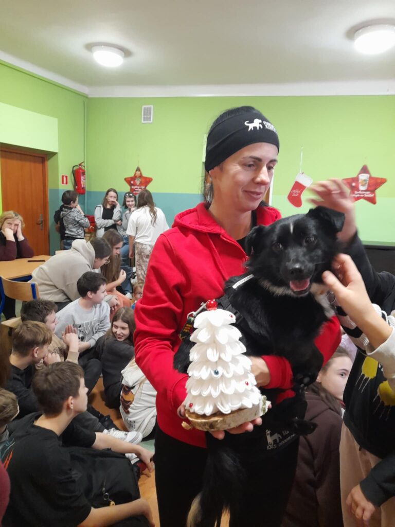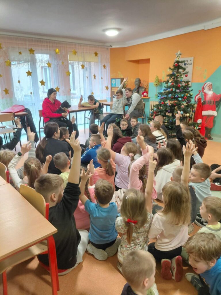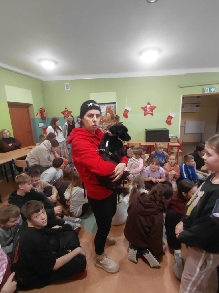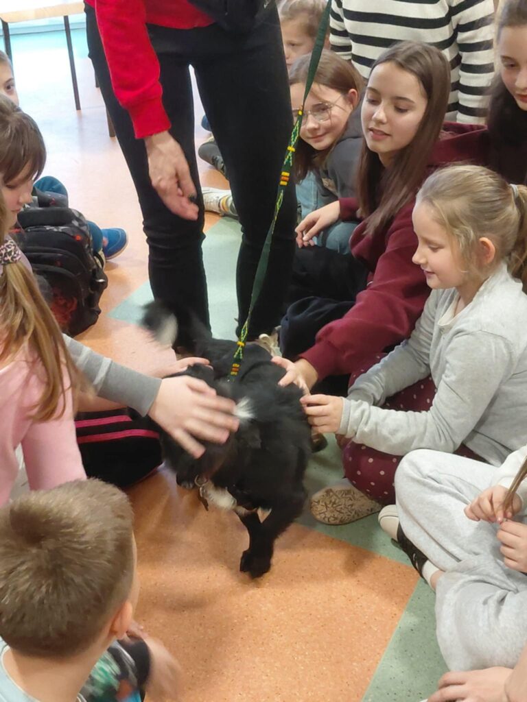 W dniu 09.12.2025 r. w Szkole Podstawowej im. Kornela Makuszyńskiego odbyło się spotkanie z panią Anną Zientarą z FUNDACJI NA RZECZ OCHRONY PRAW ZWIERZĄT „KUNDELEK”. Pani Ania opowiedziała uczniom na temat opieki nad zwierzętami, pracy fundacji na rzecz zwierząt, zapobiegania bezdomności zwierząt oraz przepisach dotyczących adopcji zwierząt. Przypomniała również dzieciom o zachowaniu się w przypadku kontaktu z agresywnymi zwierzętami. Podczas spotkania przekazaliśmy karmę dla psów i kotów zebranych przez uczniów naszej szkoły w ramach akcji „Pełna miska dla schroniska”. Spotkanie przebiegło w miłej atmosferze ponieważ pani Ania przyjechała do nas z pieskiem „Picasso”, którego dzieci mogły dotknąć i pogłaskać. W podziękowaniu otrzymaliśmy dyplom od fundacji „Kundelek”. Dziękujemy pani Annie Zientarze za interesującą pogadankę i zaproszenie do dalszej współpracy ze schroniskiem.