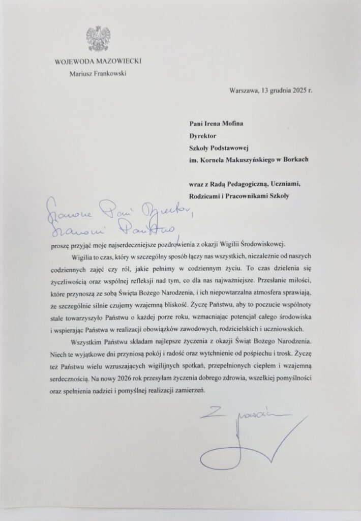 Życzenia świąteczne od Wojewody Mazowieckiego – Mariusza Frankowskiego z okazji Wigilii Środowiskowej w szkole. #MazowieckiUrzadWojewódzki