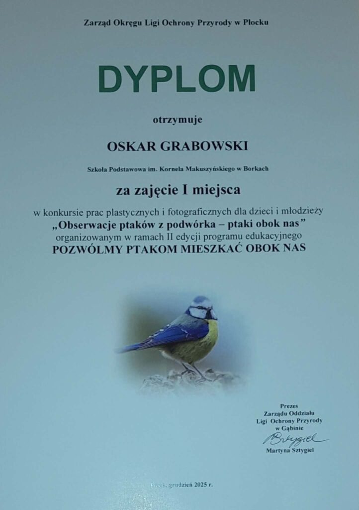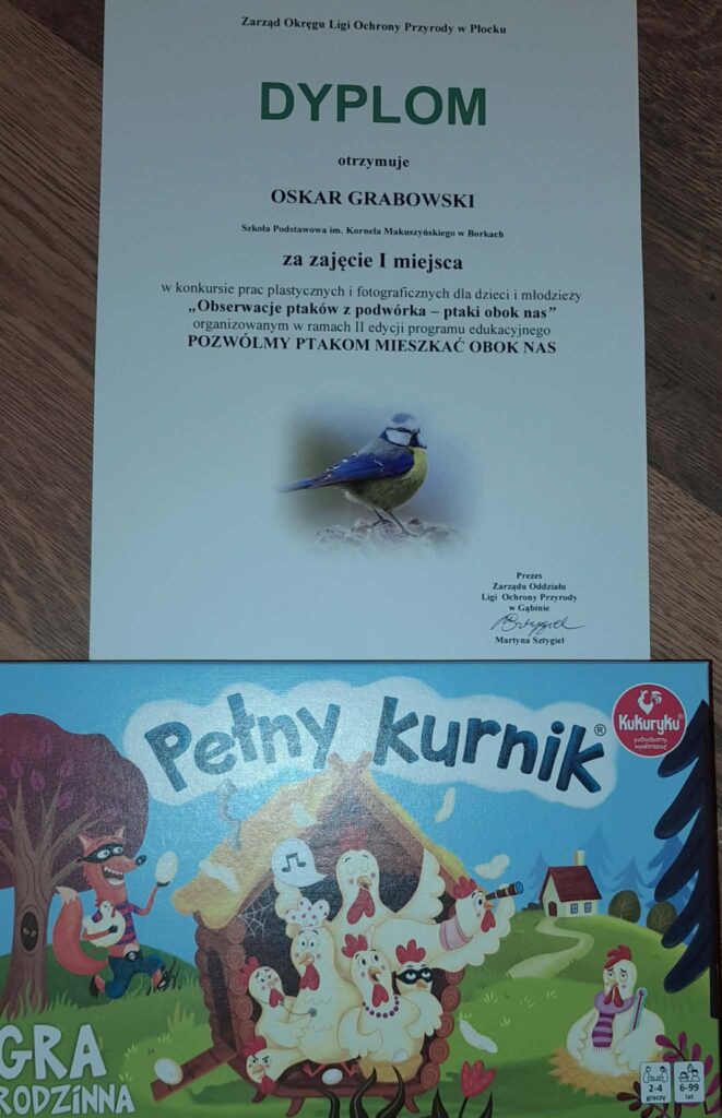 16 grudnia w Starostwie Powiatowym w Płocku odbyło się wręczenie nagród w konkursie prac plastycznych i fotograficznych dla dzieci i młodzieży ,,Obserwacje ptaków z podwórka – ptaki obok nas” organizowanym przez LOP w ramach II edycji programu edukacyjnego Pozwólmy ptakom mieszkać obok nas. Wśród laureatów byli uczniowie z naszej szkoły.