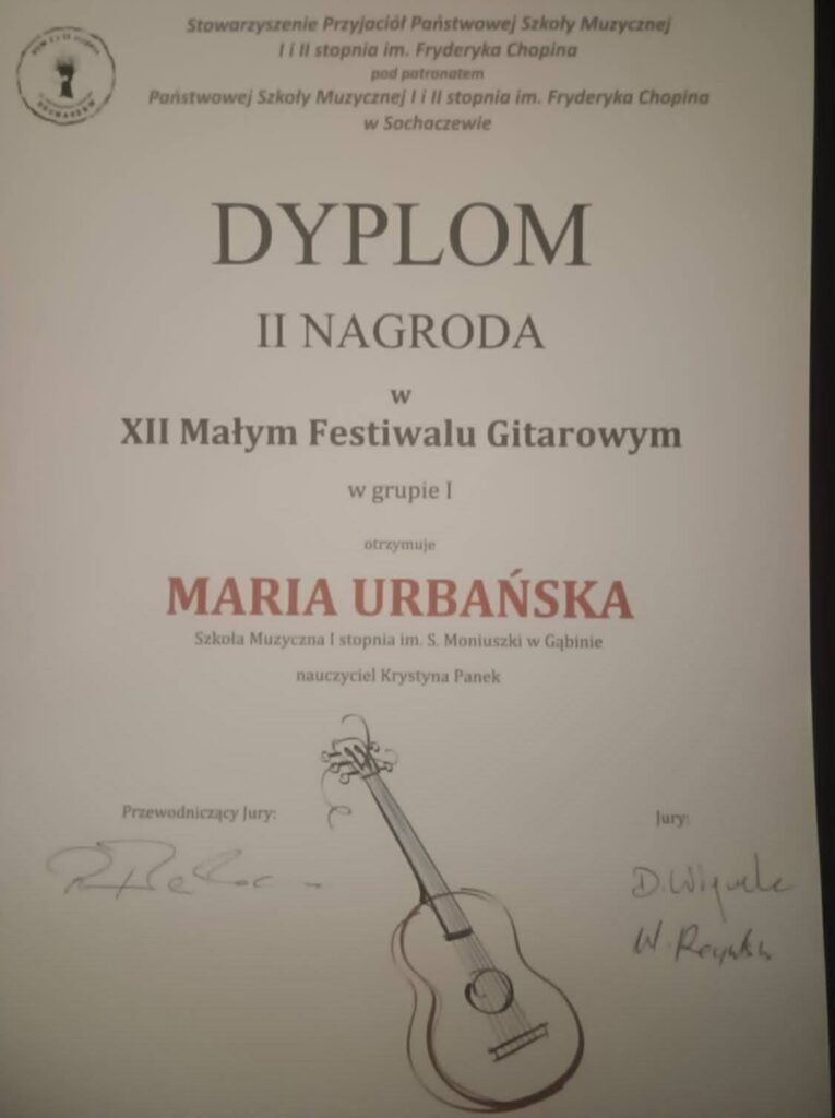 Maria Urbańska, uczennica naszej szkoły oraz Państwowej Szkoły Muzycznej I stopnia im.Stanisława Moniuszki w Gąbinie dnia 2 marca 2026 roku wzięła udział w XII Festiwalu Gitarowym w Sochaczewie.